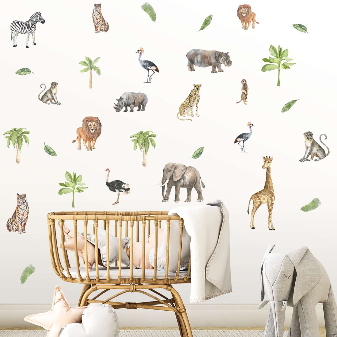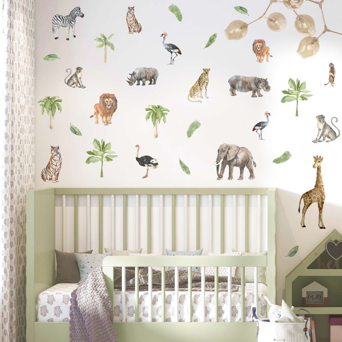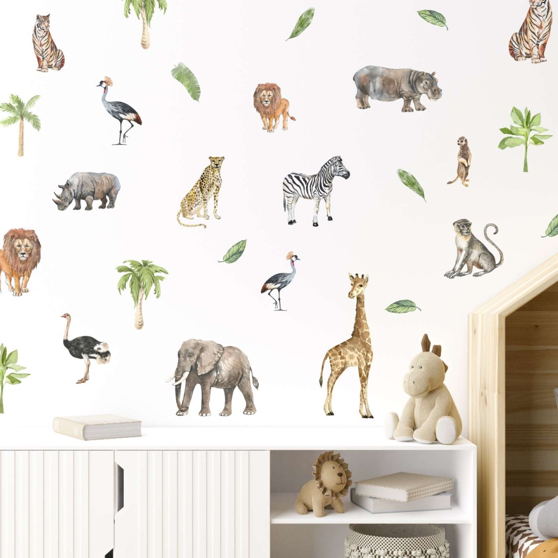 Χαριτωμένα παιδικά αυτοκόλλητα τοίχου watercolor με ζώα της Αφρικής.