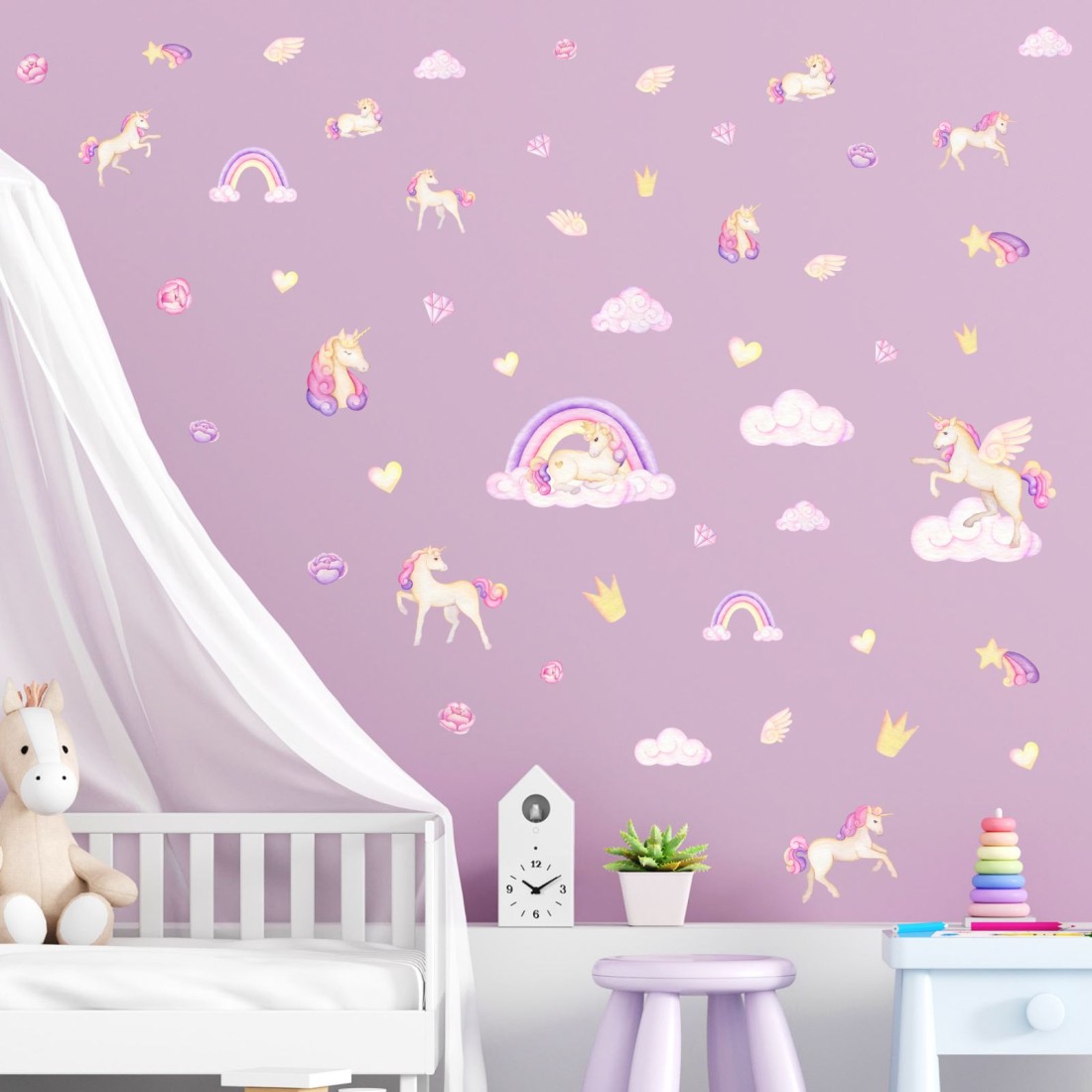 Αυτοκόλλητα τοίχου με Μονόκερους, ουράνια τόξα, σύννεφα και διάφορα παραμυθένια στοιχεία σε παστέλ χρώματα.