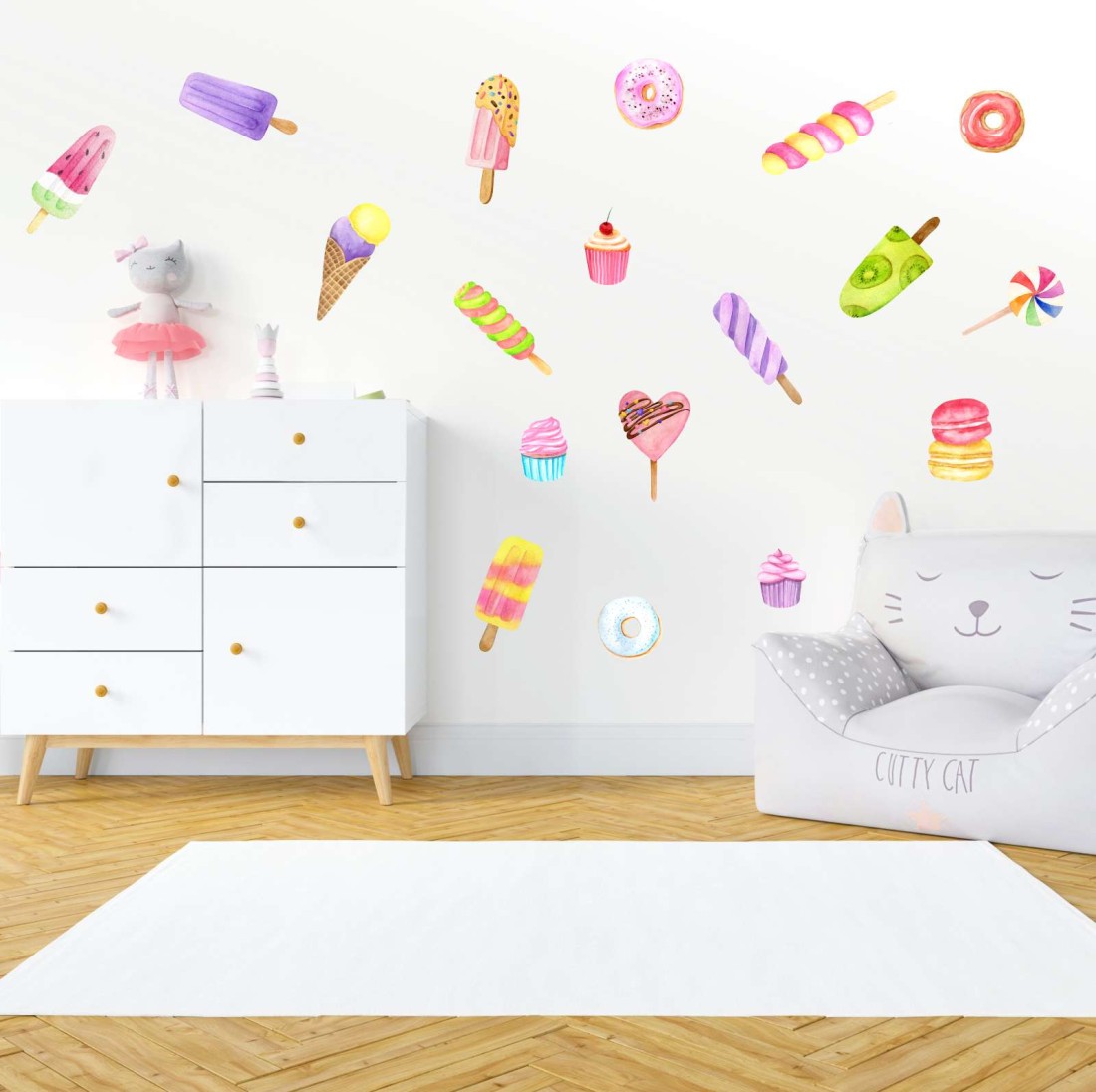 Πολύχρωμο αυτοκόλλητο τοίχου με διάφορα γλυκά και παγωτά.