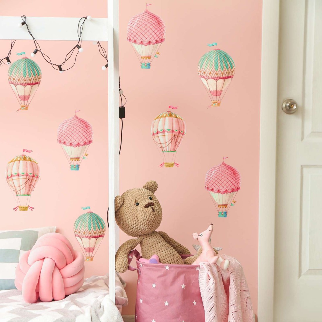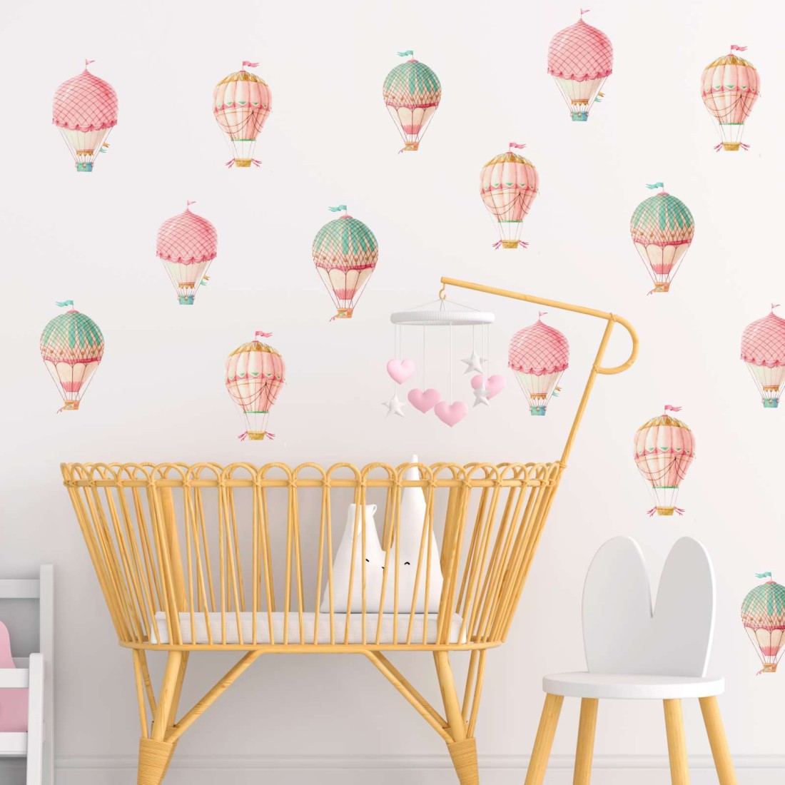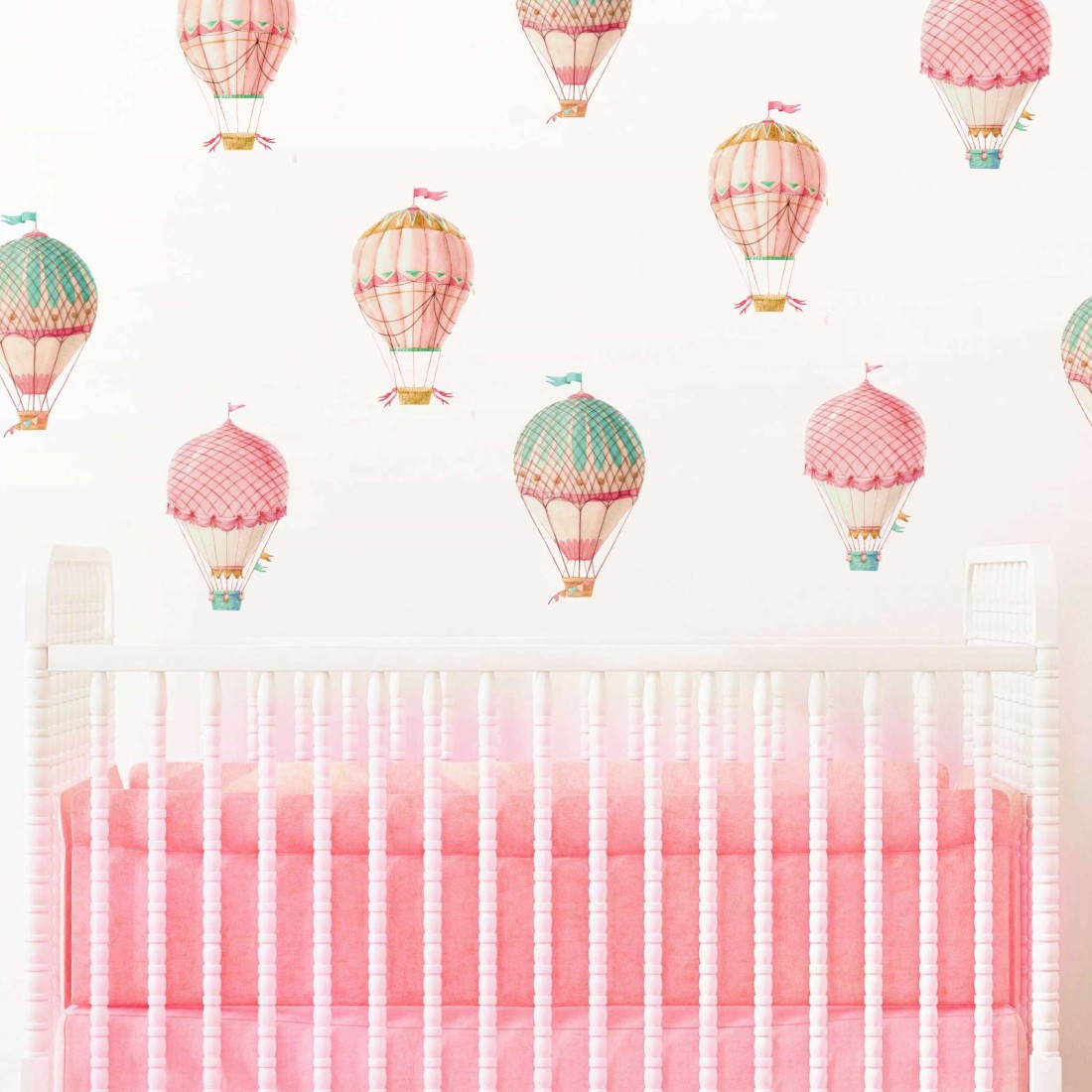 Παιδικό αυτοκόλλητο τοίχου με όμορφα αερόστατα και σύννεφα σε αποχρώσεις ροζ και τιρκουάζ.